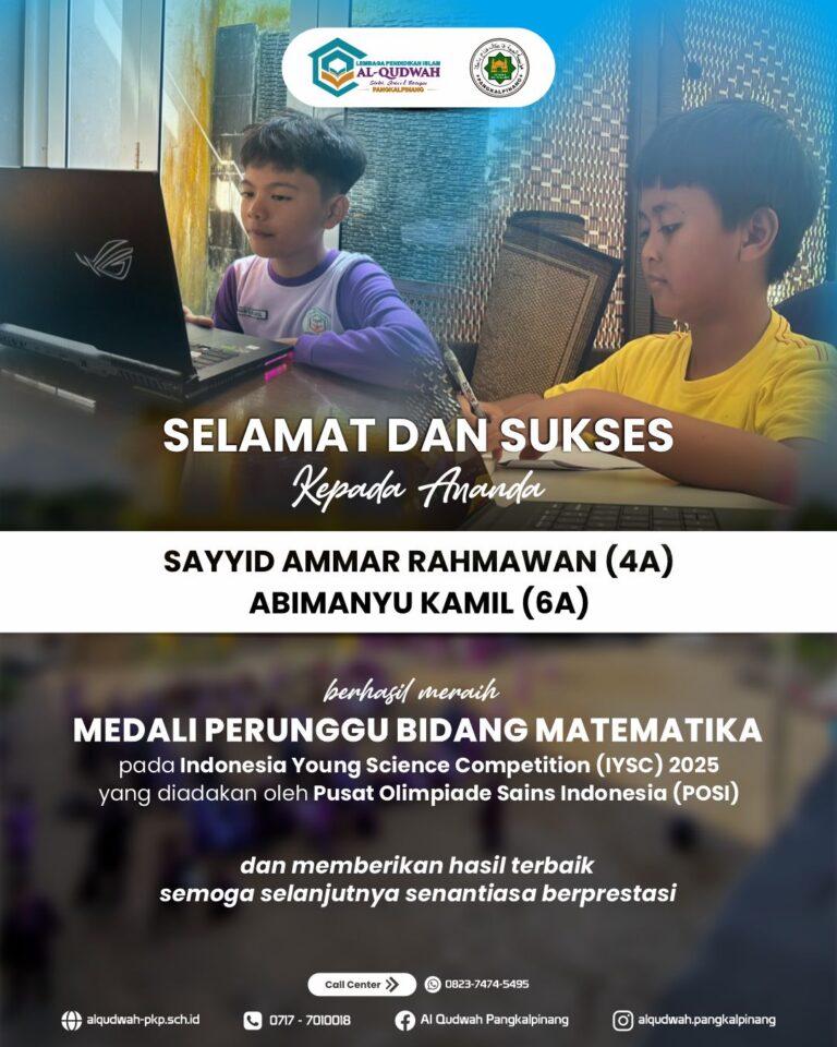 Al Qudwah – Minggu, 26 Oktober 2025 sebanyak 23 siswa SDIT Al Qudwah Pangkalpinang mengikuti ajang Indonesia Young Science Competition (IYSC) yang diadakan oleh Pusat Olimpiade Sains Indonesia (POSI). Bidang Olimpiade yang diikuti yaitu Matematika, IPA, IPS, dan Bahasa Inggris…